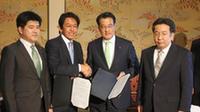 日本民主黨黨首岡田克也與維新黨黨首松野賴久26日舉行會談,簽署了確認“爭取3月份組成新黨”的文件,就兩黨合并正式達成協議。