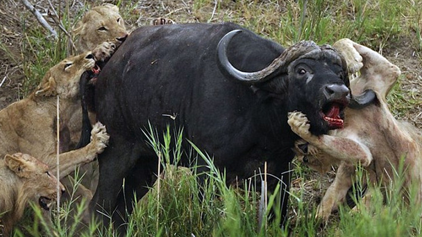 28歲的保護區(qū)管理員羅安(Roan Ravenhill)近日就拍到一組驚心動魄的照片:一只幼獅撲上一頭水牛撕咬時,腹部不幸被尖銳的牛角刺穿,并被牢牢釘住,性命攸關。這時,另外4只同伴撲上來圍攻水牛。