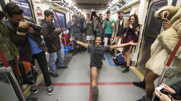 1月10日周日是一年一度的全球運(yùn)動(dòng)“不穿褲子搭地鐵日”,全球60多個(gè)城市同步進(jìn)行了不穿褲子乘坐地鐵的集體活動(dòng)。