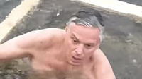 雖然57歲的洪博培走下水時,表情看上去非常勇敢,但全身浸泡在刺骨的河水里后,他不免被凍得有些驚慌。