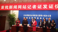 11月6日上午,首批新聞網(wǎng)站記者證發(fā)證儀式在國家互聯(lián)網(wǎng)信息辦公室舉行。新華網(wǎng)、人民網(wǎng)、中國日報網(wǎng)、中國網(wǎng)、國際在線等14家中央主要新聞網(wǎng)站的594名記者獲發(fā)記者證。