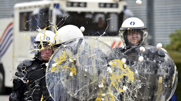收成好加上俄羅斯制裁,導致歐洲農產品價格一路下挫,憤怒不滿的數千農民9月7日集結歐盟總部抗議。歐盟隨即決定提撥5億歐元,望能暫時解決農業困境。