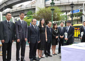 曼谷當地時間23日早8點,中國駐泰國大使館臨時代辦吳志武帶領眾多館員來到曼谷市中心的四面佛鮮花,按照中國的習俗祭奠在8月17日晚四面佛爆炸案中的各國遇難者。