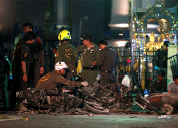 2015年8月18日,救援人員在泰國曼谷的爆炸現場進行清理。