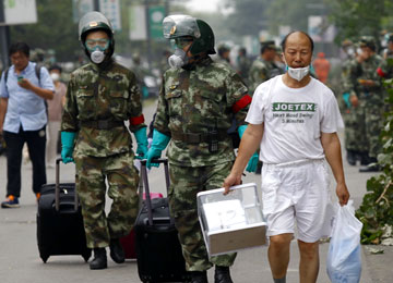 2015年8月18日,居住在距離天津“8·12”火災爆炸事故最近的萬科海港城的居民,在當地民警、武警和政府工作人員的陪同下返回家中取出物品。