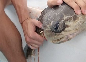 近日,在哥斯達黎加的海洋中,動物研究人員發(fā)現(xiàn)了一只雄性麗龜,他的鼻孔中插著一根長達12厘米的吸管。