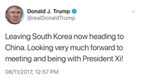 11月8日中午,美國總統(tǒng)特朗普結束對韓國的訪問,即將乘坐專機飛往中國。在對中國進行國事訪問前,特朗普在社交媒體推特(Twitter)上發(fā)文稱期待與中國國家主席習近平的會面。