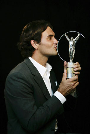 Swiss tennis legend Roger Federer kisses Laureus World Sportsman of the year trophy, he grabs the award for 3 successive years in a row.[Reuters] 123