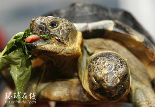 9月5日,在瑞士日內瓦,一只雙頭希臘海龜在進食。這只以古羅馬兩面神“杰納斯”命名的龜當日迎來了它的10歲生日。