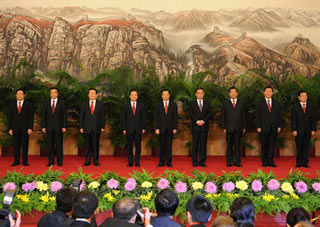 Hu Jintao (C), Wu Bangguo (4th R), Wen Jiabao (4th L), Jia Qinglin (3rd R), Li Changchun (3rd L), Xi Jinping (2nd R), Li Keqiang (2nd L), He Guoqiang (1st R) and Zhou Yongkang (1st L), who are members of the Standing Committee of the Political Bureau of the 17th Central Committee of the Communist Party of China (CPC), meet the press at the Great Hall of the People in Beijing on Oct. 22, 2007. (Xinhua)