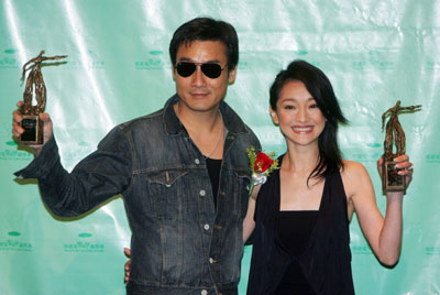 Hong Kong actor Tony Leung Ka-fai (L) and Chinese actress Zhou Xun pose during the 12th Hong Kong Film Critics Society Awards Presentation Ceremony in Hong Kong February 22, 2006. Leung won the Best Actor award for the movie "Everlasting Regret" while Zhou won the Best Actress award for the movie "Perhaps Love". (Reuters)