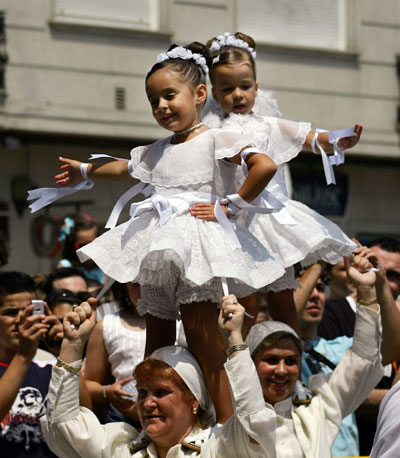 Women dance with five-year old children on their shoulders during the "Coca" celebration in Redondela, rural northeastern Spain June 18, 2006. The tradition of dancing with daughters on their shoulders takes its origins from a local legend believed to date from the Middle Ages, where two women were saved from a dragon by dancing with their daughters on their shoulders. The children are dressed in traditional costumes called "Penlas". (Reuters)