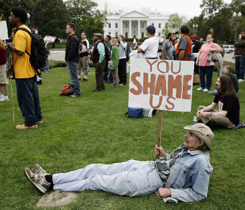 Art Grosman of Washington, DC, listens to speeches during a protest against US President George W. Bush organized by the World Can't Wait in front of the White House in Washington October 5, 2006. REUTERS/Joshua Roberts (UNITED STATES)