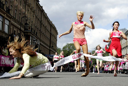 | Women compete in a high-heel sprint in St.Petersburg July 21, 2007. Some 100 women took part in the race wearing high-heeled shoes with a required minimum height of 9 centimetres (3.5 inches) to compete for ashopping voucherworth 50,000 roubles (about $2,000). [Reuters] |