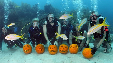Underwater Pumpkin Contest carvers display their creations amid yellowtail snappers off Key Largo, Florida in the Florida Keys National Marine Sanctuary, October 20, 2007. The contest, staged by the Amoray Dive Resort, judges divers on their artistic originality, as well as the degree of difficulty to carve the entry in the subsea environment. Linda Smith (L) and her husband Ken (not in pictures) took top honors. (Agencies)