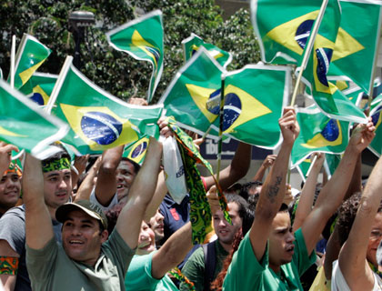 People wave the Brazilian national flag after FIFA announced that Brazil will be host of the 2014 World Cup in downtown Sao Paulo October 30, 2007. FIFA president Sepp Blatter made the announcement during the executive committee meeting in Zurich. (Agencies)