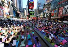 People gather to practice yoga on the morning of the summer solstice in New York's Times Square June 21, 2010.