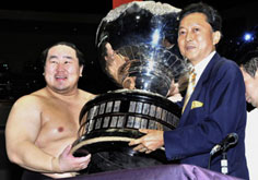 Sumo grand champion "Yokozuna" Asashoryu of Mongolia (L) receives the Prime Minister's cup from Japan's Prime Minister Yukio Hatoyama after winning the 15-day Autumn Grand Sumo Tournament in Tokyo September 27, 2009.