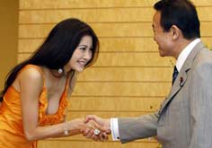 Miss Universe Japan Emiri Miyasaka chats with Japanese Prime Minister Taro Aso during her visit to the premier's official residence on May 15, 2009 in Tokyo, Japan.