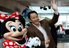 Tourists from China pose for a picture with Disney characters Mickey (R) and Minnie Mouse during a cruise for the first official Chinese tour group to the United States...