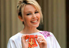 Australian singer Kylie Minogue smiles as she poses for photographers with the OBE she received from Britain's Prince Charles for her services to music at Buckingham Palace in London July 3, 2008.