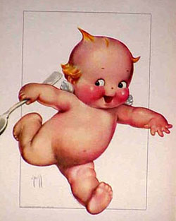 圓鼓鼓的眼睛、尖尖的頭、滿臉天真、一副乳臭未干的孩子模樣……她叫Kewpie(邱比),是美國女藝術家Rose O'Neill(羅絲·歐尼爾)于1909年創造出的娃娃形象。