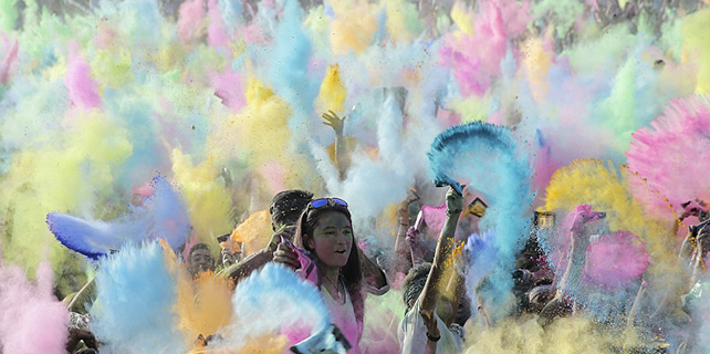 A reveller is tossed in the air during the 6th annual "Day of Colors" in Thermi, near the northern port city of Thessaloniki, Greece, September 10, 2017.