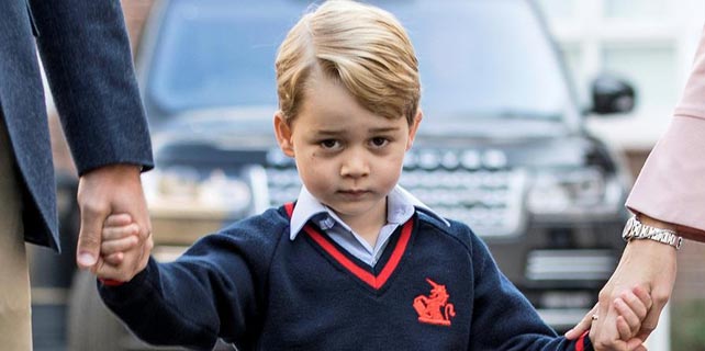 Britain's Prince George accompanied by Britain's Prince William, Duke of Cambridge arrives for his first day of school at Thomas's school in Battersea on Sept 7, 2017.