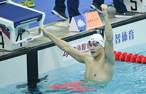 Sun Yang of Zhejiang celebrates after the men's 4×200m freestyle final at 13th Chinese National Games in North China's Tianjin Municipality, Sept 3, 2017.