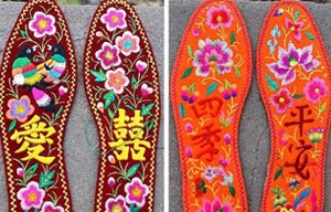 More than 200 women farmers in Shanxi province join in a handicrafts cooperative and start living on their skill in making embroidery insoles.