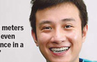 Zhang Yadong, a picture of concentration, stands in the middle of Sanlitun Village's Orange hall, plucking his acoustic guitar.