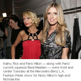 Kathy, Rick and Paris Hilton — along with Paris' current squeeze Benji Madden — were front and center Tuesday at the Mercedes-Benz L.A. Fashion Week show for Nicky Hilton's high-end Nicholai line.
