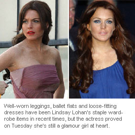 Well-worn leggings, ballet flats and loose-fitting dresses have been Lindsay Lohan's staple wardrobe items in recent times, but the actress proved on Tuesday she's still a glamour girl at heart.