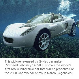 This picture released by Swiss car maker Rinspeed February 14, 2008 shows people aboard Rinspeed's new model, the sQuba, the world's first real submersible car that will be presented at the 2008 Geneva car show in March.