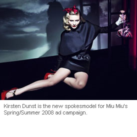 Kirsten Dunst is the new spokesmodel for Miu Miu's Spring/Summer 2008 ad campaign.The campaign was shot by Mert Alas and Marcus Piggott in Los Angeles back in November.
