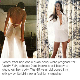Years after her iconic nude pose while pregnant for Vanity Fair, actress Demi Moore is still happy to show off her body. The 45-year-old posed in a skimpy white bikini for a fashion magazine.