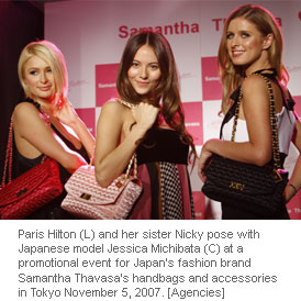 Paris Hilton (L) poses with Japanese model Jessica Michibata at a promotional event for Japan's fashion brand Samantha Thavasa's handbags and accessories in Tokyo November 5, 2007. [Agencies]