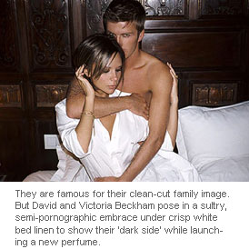 David and Victoria Beckham pose in a sultry, semi-pornographic embrace under crisp white bed linen to show their 'dark side' while launching a new perfume.