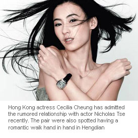 Hong Kong actress Cecilia Cheung has admitted the rumored relationship with actor Nicholas Tse recently. The pair were also spotted having a romantic walk hand in hand in Hengdian.