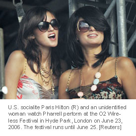 U.S. socialite Paris Hilton (R) and an unidentified woman watch Pharrell perform at the O2 Wireless Festival in Hyde Park, London on June 23, 2006. The festival runs until June 25. [Reuters]