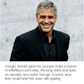 Giorgio Armani gave his younger rivals a lesson in effortless cool today, showing shirts and suits so casually sexy actor George Clooney says they could help him cope with ageing.