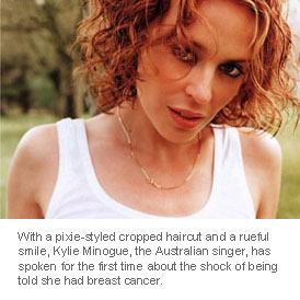 With a pixie-styled cropped haircut and a rueful smile, Kylie Minogue, the Australian singer, has spoken for the first time about the shock of being told she had breast cancer.