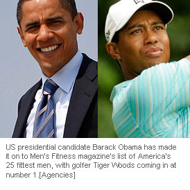 US presidential candidate Barack Obama has made it on to Men's Fitness magazine's list of America's 25 fittest men, with golfer Tiger Woods coming in at number 1.