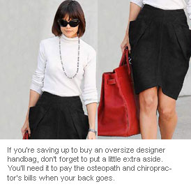 If you're saving up to buy an oversize designer handbag, don't forget to put a little extra aside.You'll need it to pay the osteopath and chiropractor's bills when your back goes.