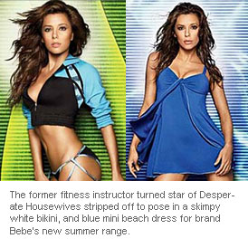The former fitness instructor turned star of Desperate Housewives stripped off to pose in a skimpy white bikini, and blue mini beach dress for brand Bebe's new summer range.