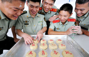 Soldiers make mooncakes at a base for armed border forces in Taizhou, East China's Zhejiang province, Sept 6, 2011.