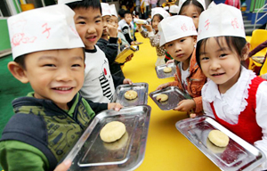 Children prepare moon cakes to celebrate the upcoming Mid-Autumn Festival in Shangdong province on Sept 7, 2011.