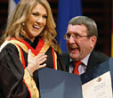 Canadian singer Celine Dion (L) smiles as she poses with Quebec's mayor Regis Labeaume (R) after she received an honorary doctorate in music from Laval University at the Palais Montcalm in Quebec City, August 21, 2008.