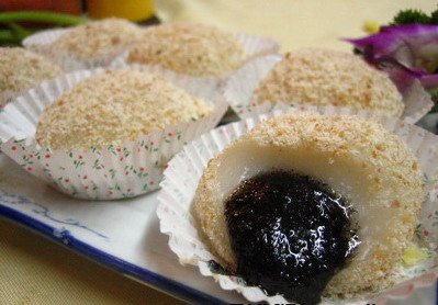 This is a kind of glutinous rice dumpling stuffed with meat, sweetened bean paste, or sesame.
