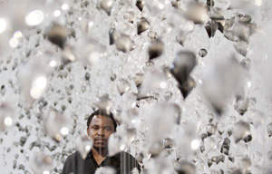 An artwork titled "Between Earth and Clouds" by Bright Ugohukwu Eke is displayed as part of the "DON'T/PANIC" exhibition at the Durban Art Gallery Nov 24, 2011.